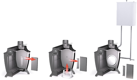Высокую скорость нагрева помещения создают конвективные потоки, которые формирует эффективная система направленной конвекции и возможности подключения теплоносителя с помощью опции (теплообменник). Продолжительность работы печи обеспечивается работой оборудования в режиме длительного горения, где происходит дополнительное дожигание топочного газа.
